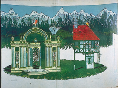 Stage design for The Fowler by Carl Zeller, South Bohemian Theatre, Ceské Budcjovice, 1986, Luboterc, director; acrylic on paper, 34" x 49 1/3"