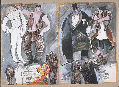 Costume designs for Jacques and His Master by Denis Diderot and Milan Kundera, Petr Bezruc Theatre, Ostrava, 1997, Josef Janík, director; tempera and drawing on paper, two units, each 24" x 16 3/4"